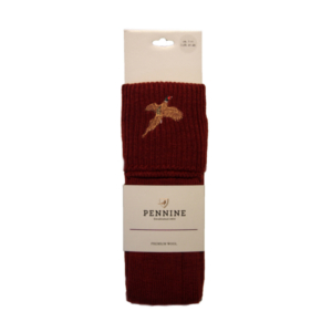 Pennine Stalker high content premium wool, British made shooting sock with reinforced toe and heel, embroidered pheasant motif, washable at 30 degrees. Colours : Burgundy, Rouge and Olive. Size: UK 4-7 & 7-11...